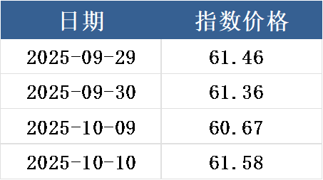 2025年9月29日至2025年10月10日,上海碳价格指数期初为61.46元/吨,期末为61.58元/吨; 上涨0.20%。指数周度数据如下表所示: