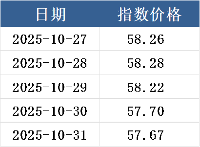 2025年10月27日至2025年10月31日,上海碳价格指数期初为58.26元/吨,期末为57.67元/吨; 下跌1.01%。指数周度数据如下表所示: