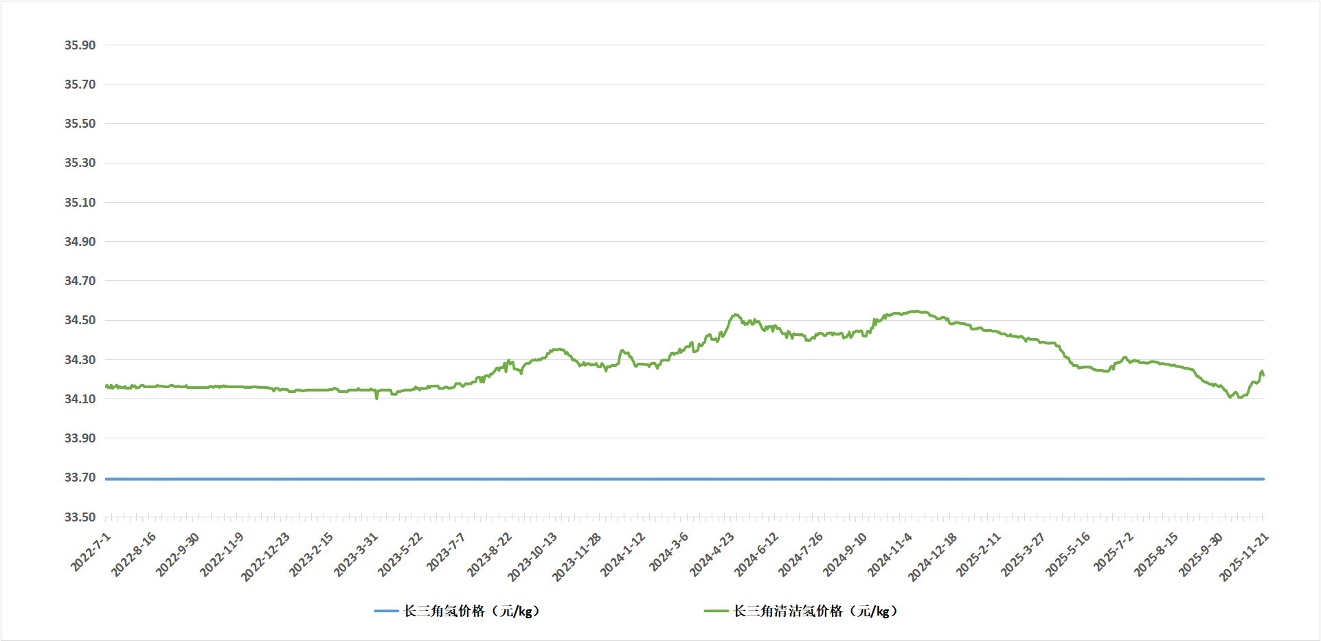 2025年11月24日,长三角氢价格为33.69元/公斤,长三角清洁氢价格为34.22元/公斤,唐山氢价格为34.83元/公斤,珠三角氢价格为38.13元/公斤,河南氢价格29.33元/公斤,新疆氢价格40.25元/公斤。